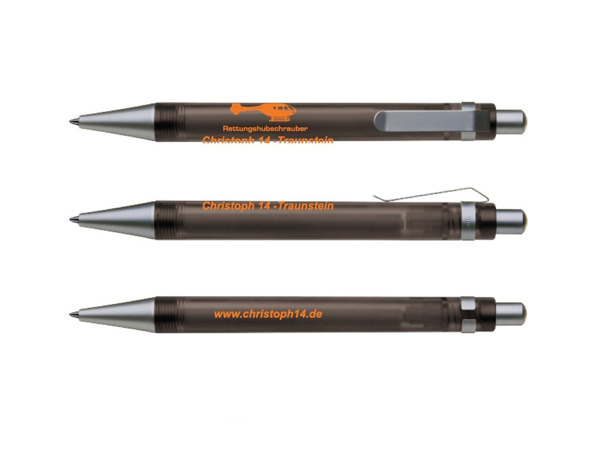 Mattverchromter Druckkugelschreiber mit Metallbeschlagteilen.