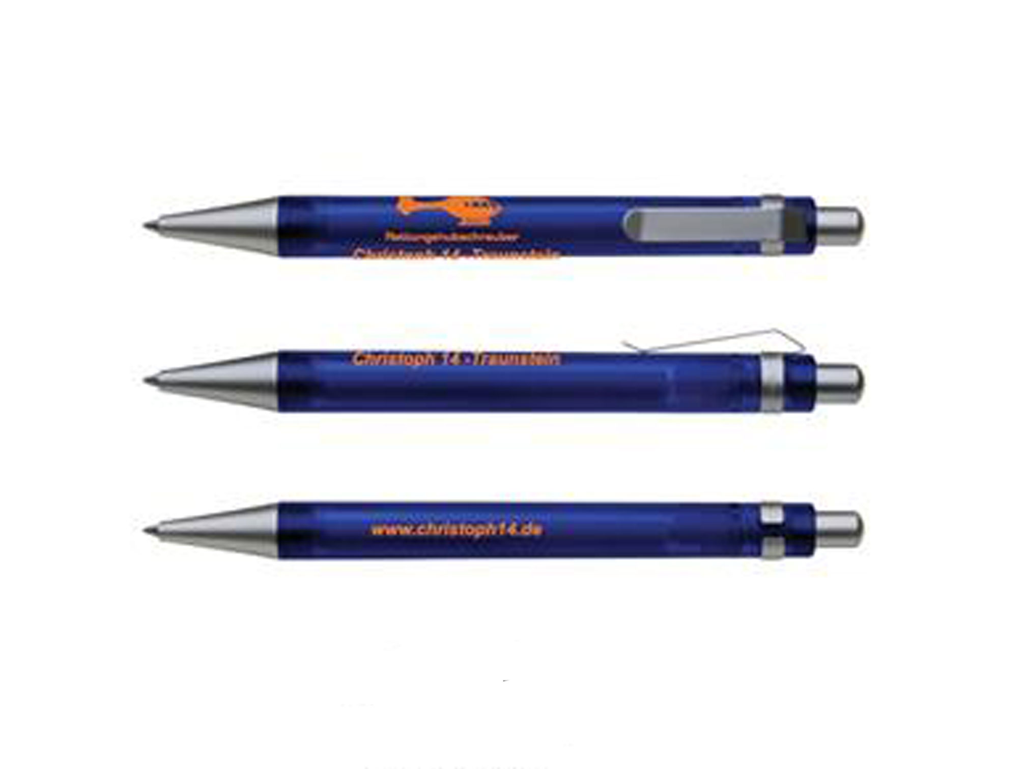 Mattverchromter Druckkugelschreiber mit Metallbeschlagteilen.